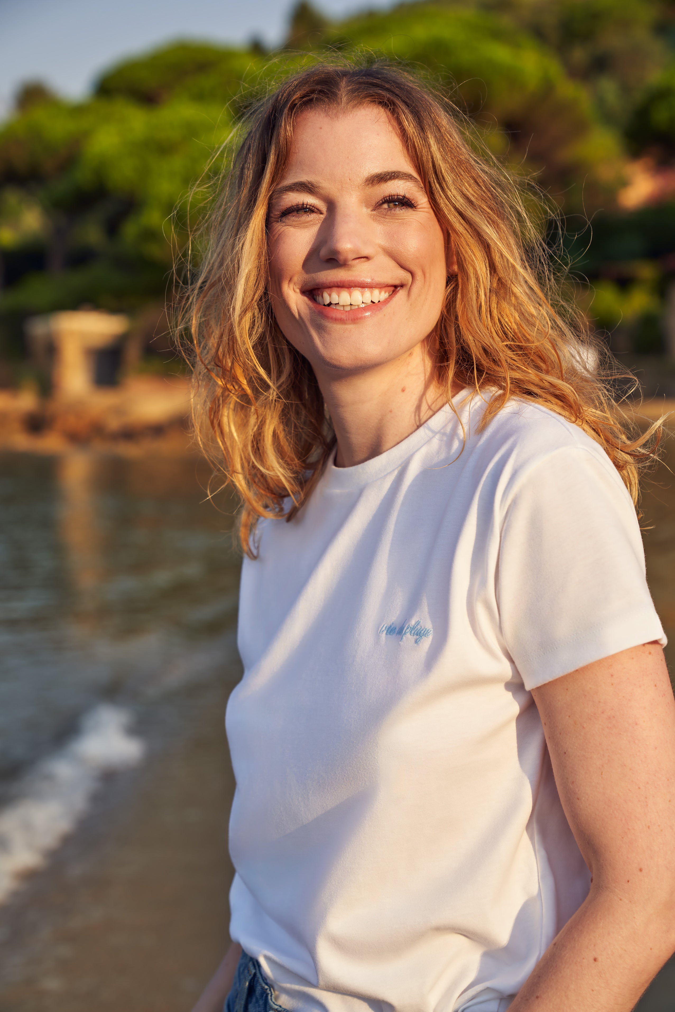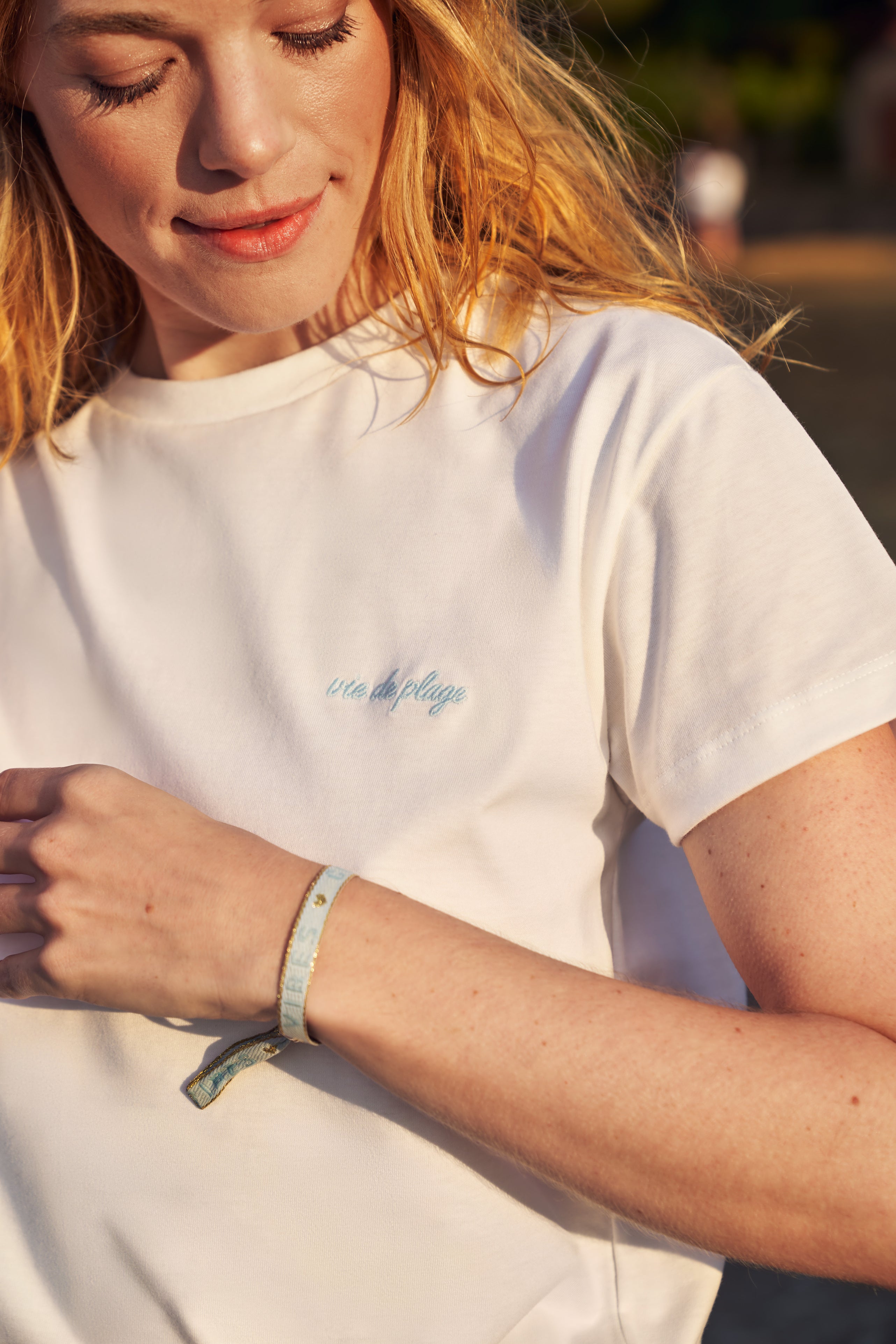 Dezenter gestickter Schriftzug - "Vie de Plage" in Blau - weißes T-Shirt aus 100 Prozent Bio-Baumwolle von Sobrement
