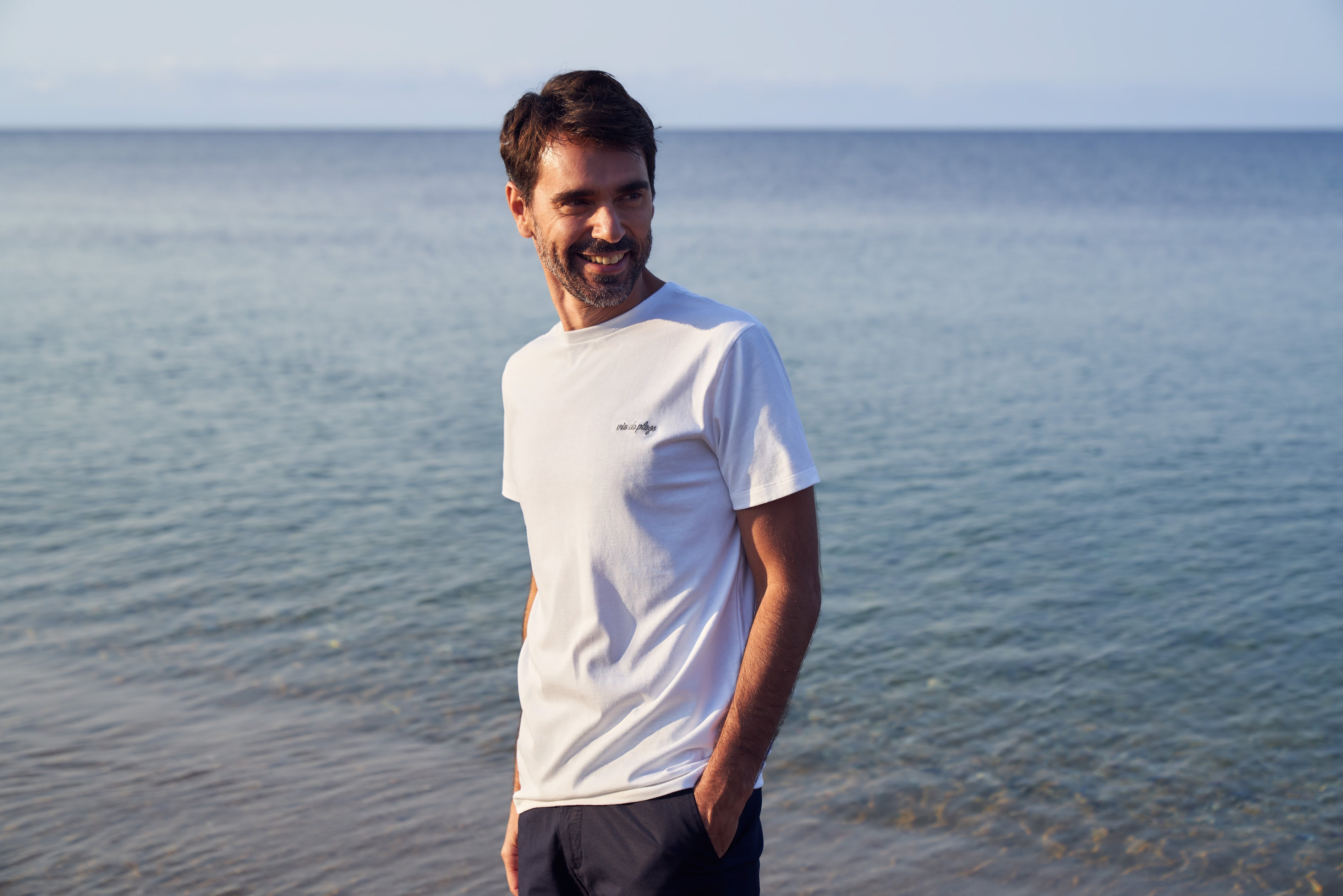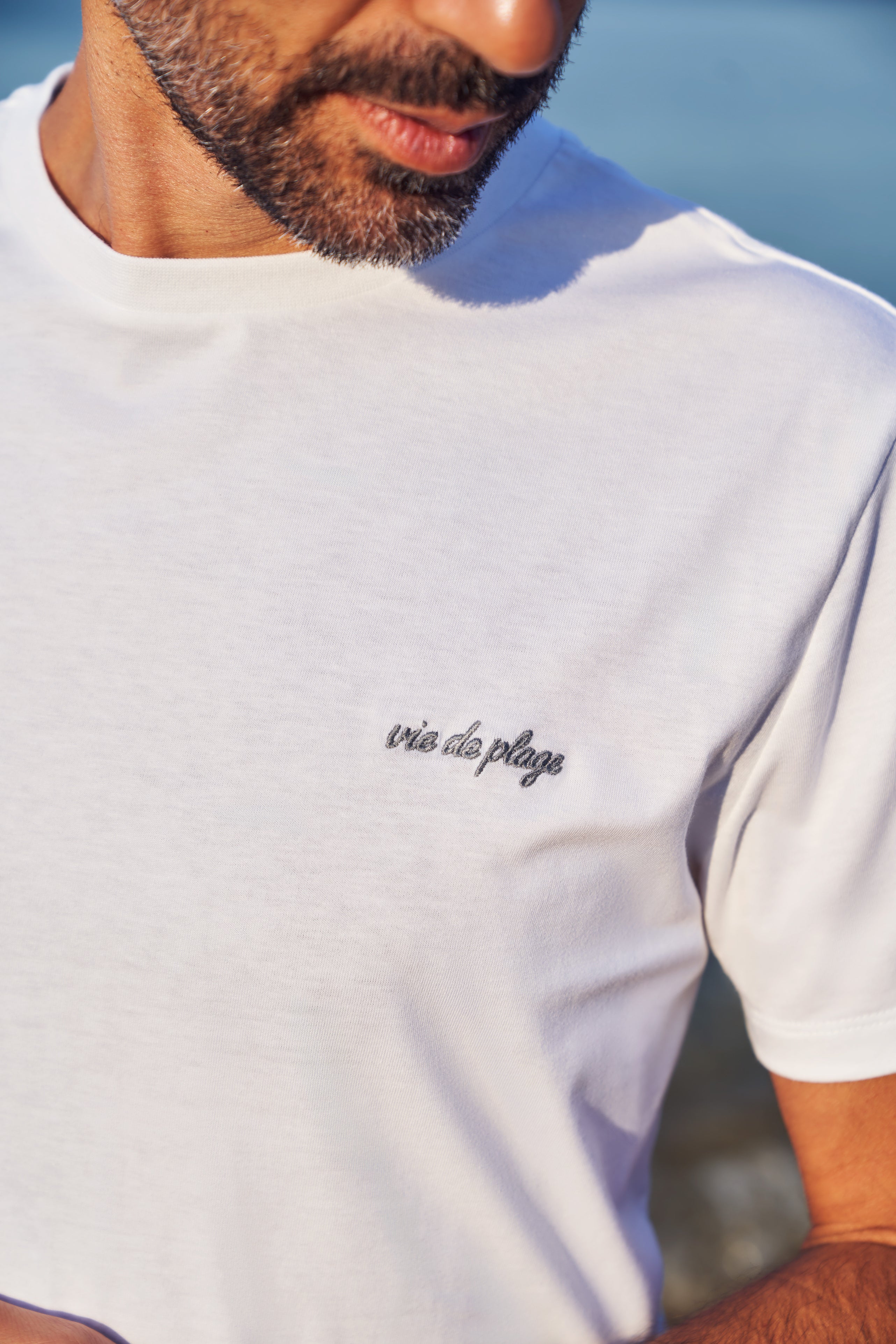 Dezenter gestickter Schriftzug - "Vie de Plage" in Grau - weißes T-Shirt aus 100 Prozent Bio-Baumwolle von Sobrement