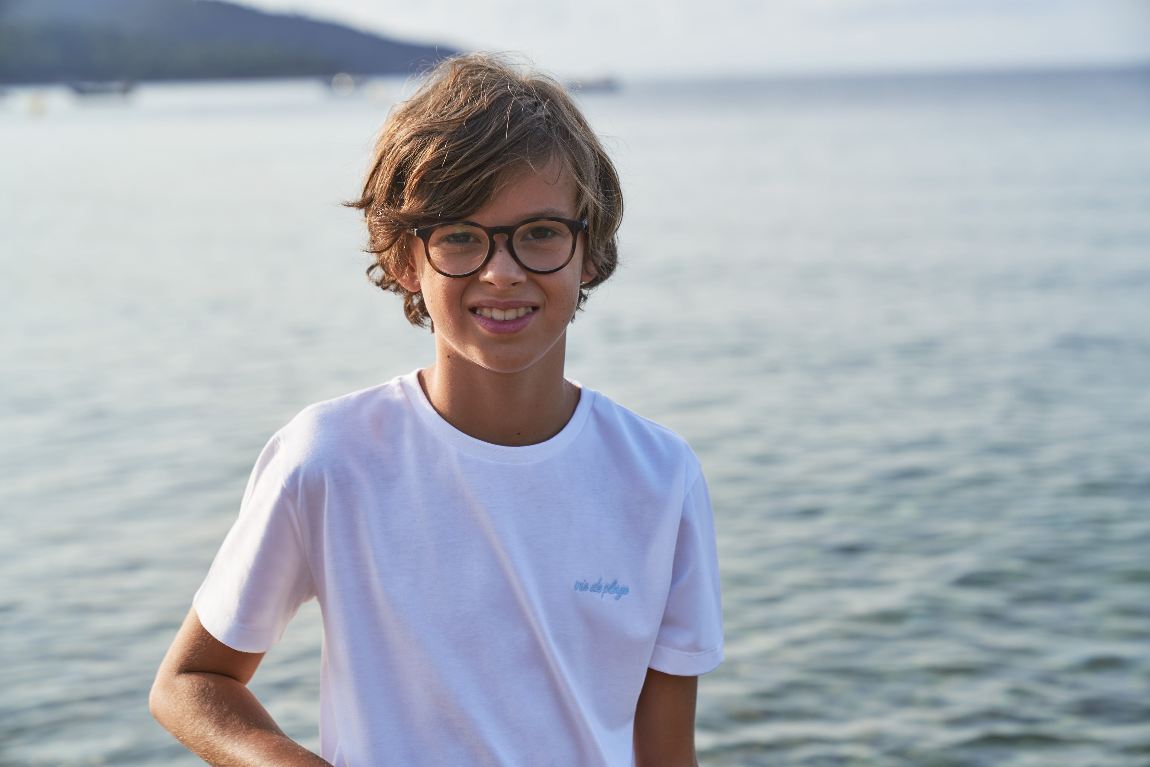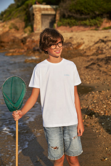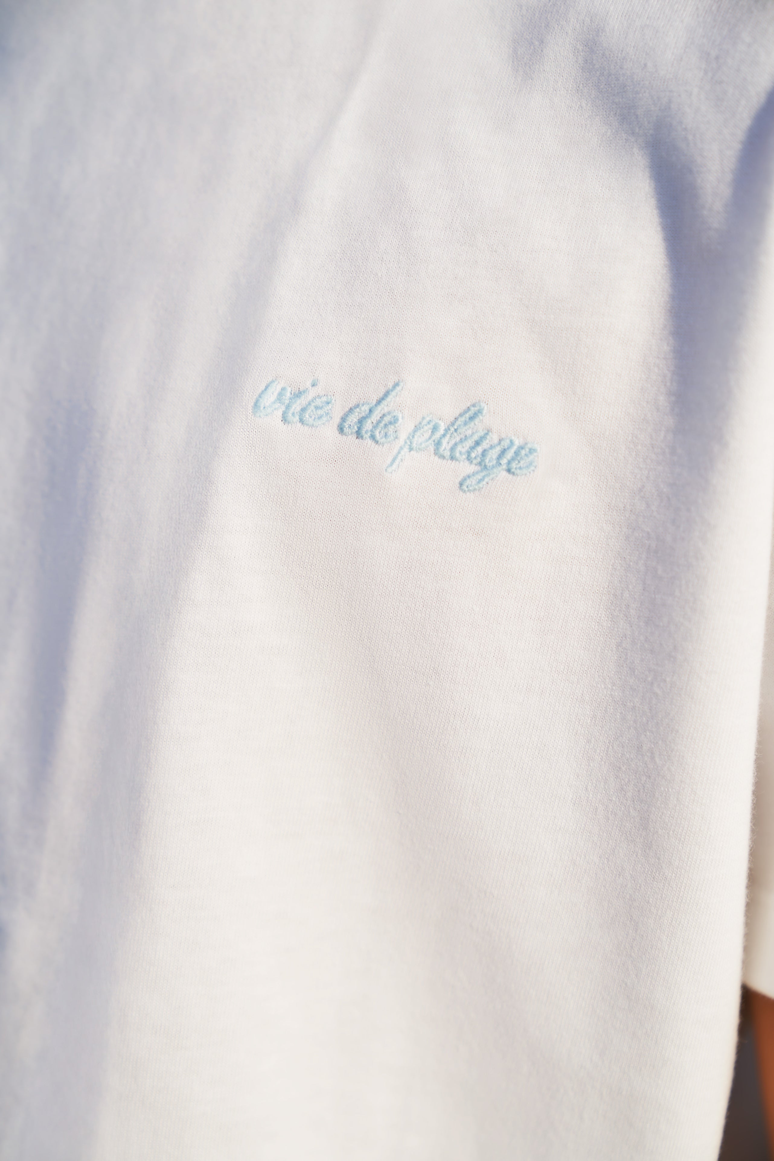 Dezenter gestickter Schriftzug - "Vie de Plage" in Blau - weißes T-Shirt aus 100 Prozent Bio-Baumwolle von Sobrement