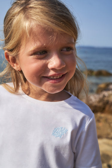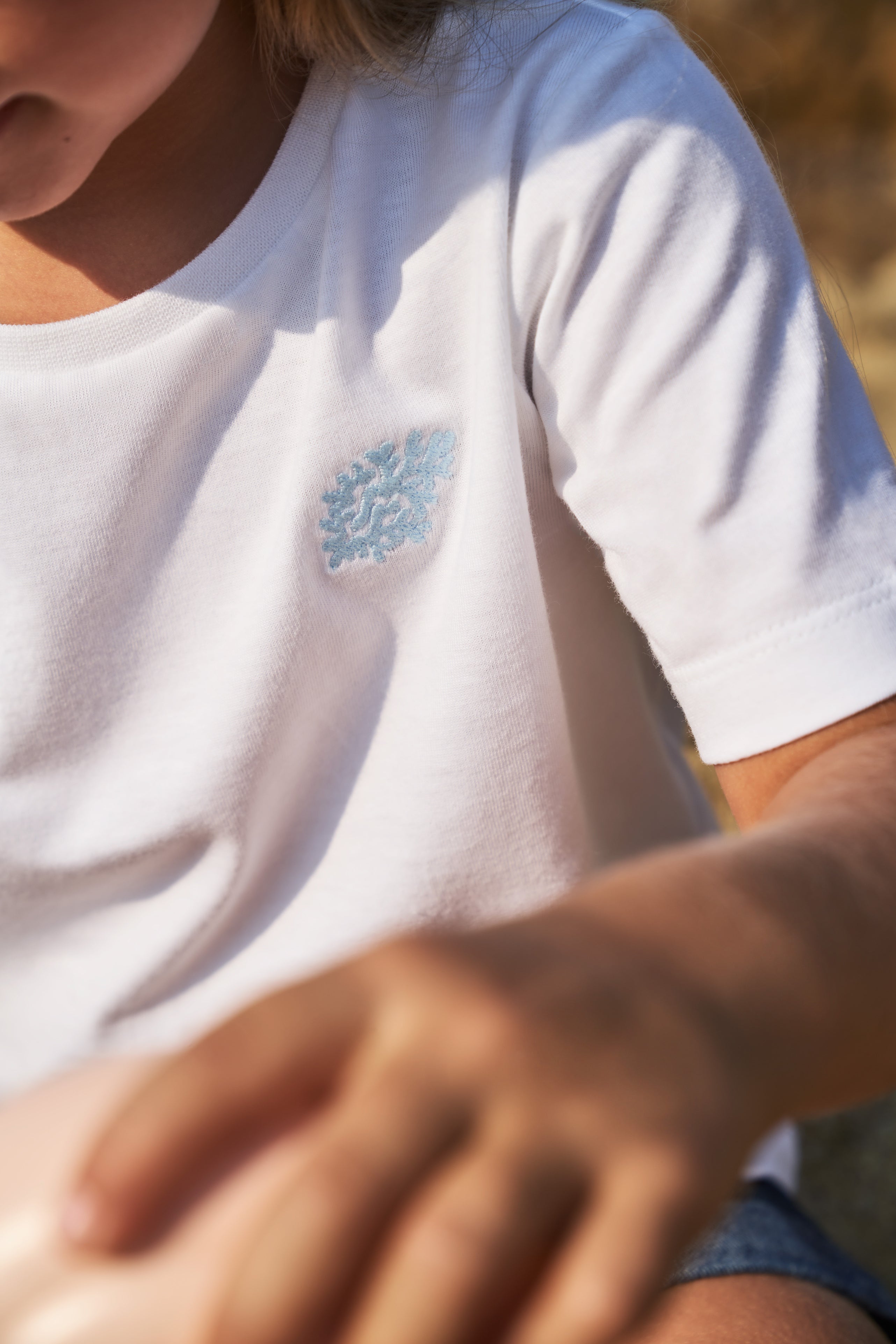 Klassisches weißes T-Shirt für Kinder. Aus Bio-Baumwolle mit kleiner gestickter Koralle in Blau auf der Brust - dem Markenzeichen von Sobrement